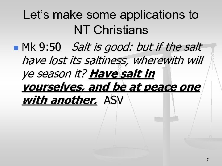 Let’s make some applications to NT Christians n Mk 9: 50 Salt is good: but if the salt have lost its saltiness, wherewith will ye season it? Have salt in yourselves, and be at peace one with another. ASV 7