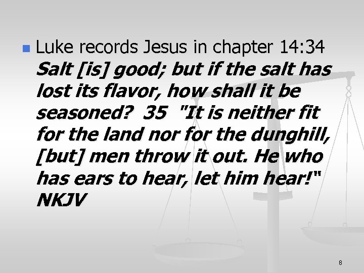 n Luke records Jesus in chapter 14: 34 Salt [is] good; but if the salt has lost its flavor, how shall it be seasoned? 35 "It is neither fit for the land nor for the dunghill, [but] men throw it out. He who has ears to hear, let him hear!“ NKJV 8