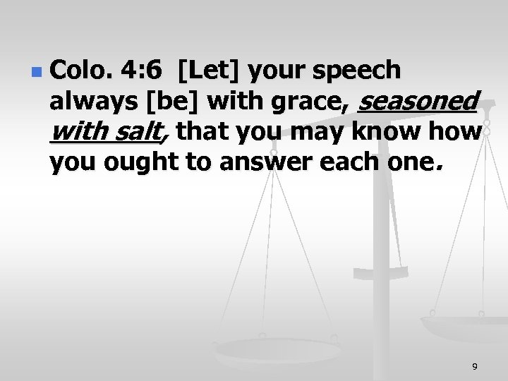 n Colo. 4: 6 [Let] your speech always [be] with grace, seasoned with salt, that you may know how you ought to answer each one. 9