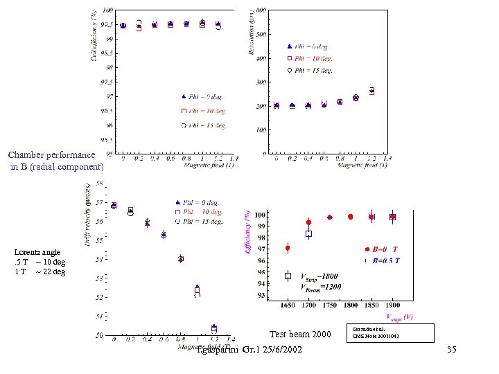 Chamber performance in B (radial component) 56 55 54 53 Lorentz angle. 5 T ~ 10 deg 1 T ~ 22 deg 52 51 50 49 48 Test beam 2000 f. gasparini Gr. 1 25/6/2002 Cerrada et al. CMS Note 2001/041 35