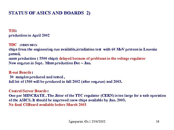 STATUS OF ASICS AND BOARDS 1) BTI: all available (55. 000) BTI modules: tender closed , contract signed 6 May 2002(tender closed at CERN in August 2001) production : 50 samples July, 300 October Hope to have 1000/month starting in December (12. 500 modules) TRACO: 10 samples positively tested in January 2002 , full lot (5500) delivered Trigger Boards: call for tender in Apr. 9. Offers by June 28 Approval from INFN July. Preserie (50 =~ 7 Minicrates) in Dec 2002 First batch (200) by April 2003, then 200 boards/month end Prod. Beginning 2004 (1500 boards) TEST ON 25 ns BUNCHED BEAM IN MAY 03 For first installation >= 38 Minicrates are needed And mass assembly can begin only in April 2003. f. gasparini Gr. 1 25/6/2002 37