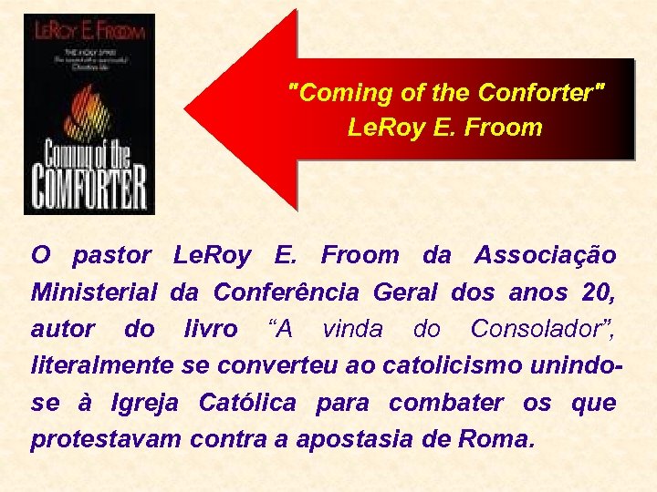 "Coming of the Conforter" Le. Roy E. Froom O pastor Le. Roy E. Froom da Associação Ministerial da Conferência Geral dos anos 20, autor do livro “A vinda do Consolador”, literalmente se converteu ao catolicismo unindose à Igreja Católica para combater os que protestavam contra a apostasia de Roma.
