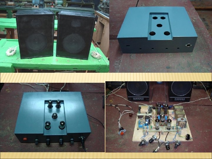 3. ДИЗАЙН-АНАЛИЗ Собранный усилитель представляет собой коробку среднего размера серого цвета. В верхней крышке просверлены специальные отверстия для ламп, которые выходят наружу. Ближе к передней крышке стоят две лампы 6 Е 1 П (индикаторы), ближе к задней крышке – две лампы 6 П 14 П, а посередине – 6 Н 3 П. На передней крышке размещены регуляторы громкостей каналов усиления, регуляторы индикатора и гнездо для входного сигнала. На задней крышке размещены гнезда для колонок, гнездо для предохранителя и отверстие для кабеля питания.
