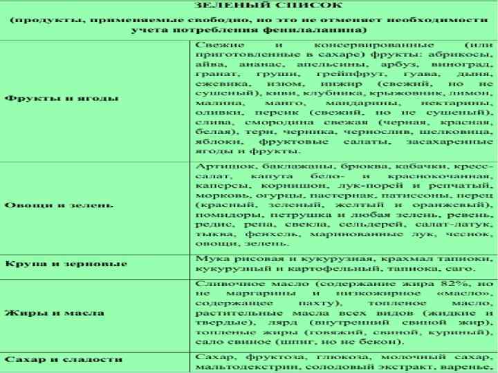 n Меню вегетарианского типа с использованием малобелковых продуктов питания и ежедневное употребление лечебного продукта в виде смеси аминокислот или гидролизата белка, которые не содержат ФА с добавлением витаминов и микроэлементов. Для детей до 1 года – « Афенилак» , «Лофеналак» . После года- «Тетрафен» , «Фенил-фри» , «Максамаид ХР» .