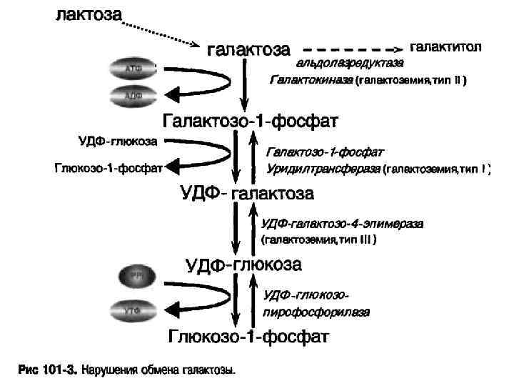 n Галактоземия- наследственное аутосомнорецессивное нарушение обмена углеводов, при котором накапливается избыток галактозы и ее метаболитов, что обуславливает клиническую картину заболевания и формирует отсроченных осложнений.