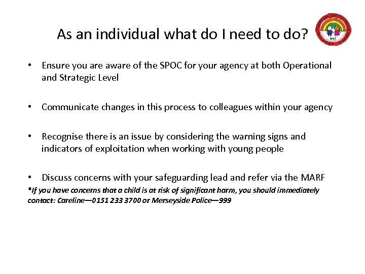 As an individual what do I need to do? • Ensure you are aware of the SPOC for your agency at both Operational and Strategic Level • Communicate changes in this process to colleagues within your agency • Recognise there is an issue by considering the warning signs and indicators of exploitation when working with young people • Discuss concerns with your safeguarding lead and refer via the MARF *If you have concerns that a child is at risk of significant harm, you should immediately contact: Careline— 0151 233 3700 or Merseyside Police— 999