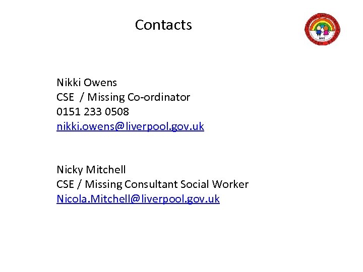 Contacts Nikki Owens CSE / Missing Co-ordinator 0151 233 0508 nikki. owens@liverpool. gov. uk Nicky Mitchell CSE / Missing Consultant Social Worker Nicola. Mitchell@liverpool. gov. uk