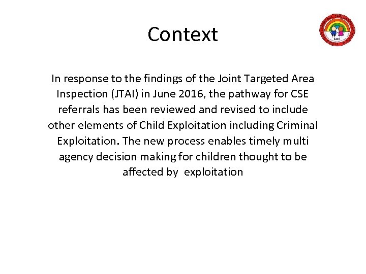 Context In response to the findings of the Joint Targeted Area Inspection (JTAI) in June 2016, the pathway for CSE referrals has been reviewed and revised to include other elements of Child Exploitation including Criminal Exploitation. The new process enables timely multi agency decision making for children thought to be affected by exploitation