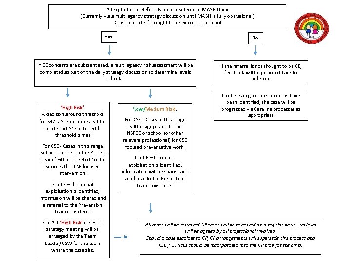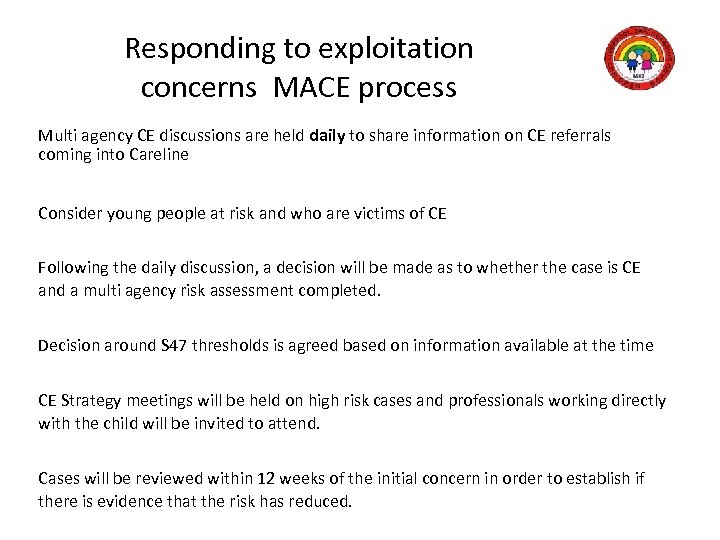 Responding to exploitation concerns MACE process Multi agency CE discussions are held daily to share information on CE referrals coming into Careline Consider young people at risk and who are victims of CE Following the daily discussion, a decision will be made as to whether the case is CE and a multi agency risk assessment completed. Decision around S 47 thresholds is agreed based on information available at the time CE Strategy meetings will be held on high risk cases and professionals working directly with the child will be invited to attend. Cases will be reviewed within 12 weeks of the initial concern in order to establish if there is evidence that the risk has reduced.