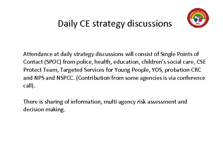 Daily CE strategy discussions Attendance at daily strategy discussions will consist of Single Points of Contact (SPOC) from police, health, education, children’s social care, CSE Protect Team, Targeted Services for Young People, YOS, probation CRC and NPS and NSPCC. (Contribution from some agencies is via conference call). There is sharing of information, multi agency risk assessment and decision making.