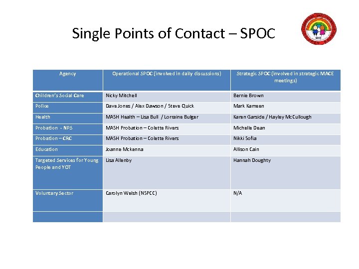 Single Points of Contact – SPOC Agency Operational SPOC (involved in daily discussions) Strategic SPOC (involved in strategic MACE meetings) Children’s Social Care Nicky Mitchell Bernie Brown Police Dave Jones / Alex Dawson / Steve Quick Mark Kameen Health MASH Health – Lisa Bull / Lorraine Bulger Karen Garside / Hayley Mc. Cullough Probation - NPS MASH Probation – Colette Rivers Michelle Dean Probation – CRC MASH Probation – Colette Rivers Nikki Sofia Education Joanne Mckenna Allison Cain Targeted Services for Young People and YOT Lisa Allenby Hannah Doughty Voluntary Sector Carolyn Welsh (NSPCC) N/A