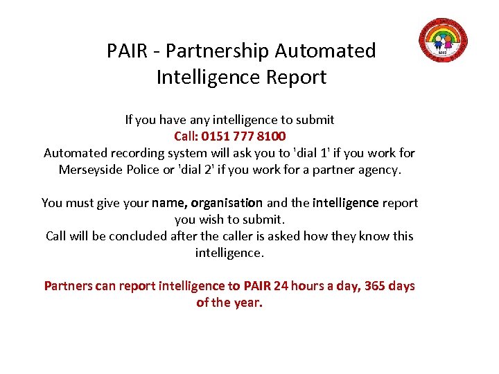 PAIR - Partnership Automated Intelligence Report If you have any intelligence to submit Call: 0151 777 8100 Automated recording system will ask you to 'dial 1' if you work for Merseyside Police or 'dial 2' if you work for a partner agency. You must give your name, organisation and the intelligence report you wish to submit. Call will be concluded after the caller is asked how they know this intelligence. Partners can report intelligence to PAIR 24 hours a day, 365 days of the year.