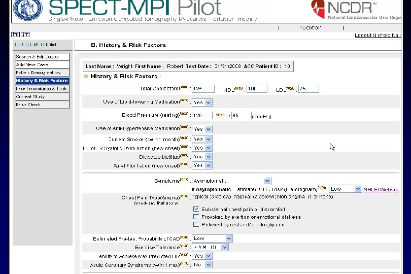 DATA COLLECTION FORM • Front page – Patient Demographics – History & Risk Factors, – Prior procedures & Tests • Back page – Current Study – Reference section • Designed to be completed in one minute or less