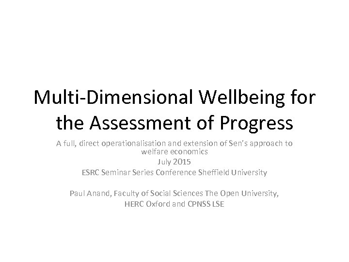 Multi-Dimensional Wellbeing for the Assessment of Progress A full, direct operationalisation and extension of Sen’s approach to welfare economics July 2015 ESRC Seminar Series Conference Sheffield University Paul Anand, Faculty of Social Sciences The Open University, HERC Oxford and CPNSS LSE