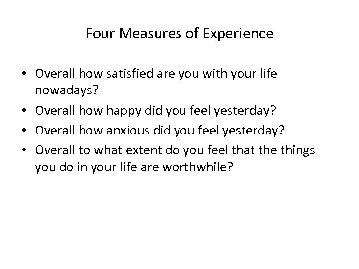 Four Measures of Experience • Overall how satisfied are you with your life nowadays? • Overall how happy did you feel yesterday? • Overall how anxious did you feel yesterday? • Overall to what extent do you feel that the things you do in your life are worthwhile?