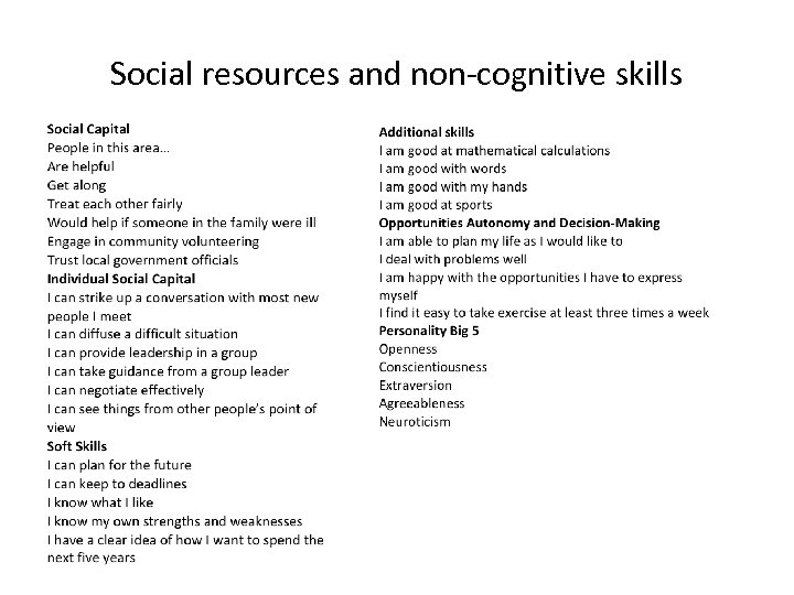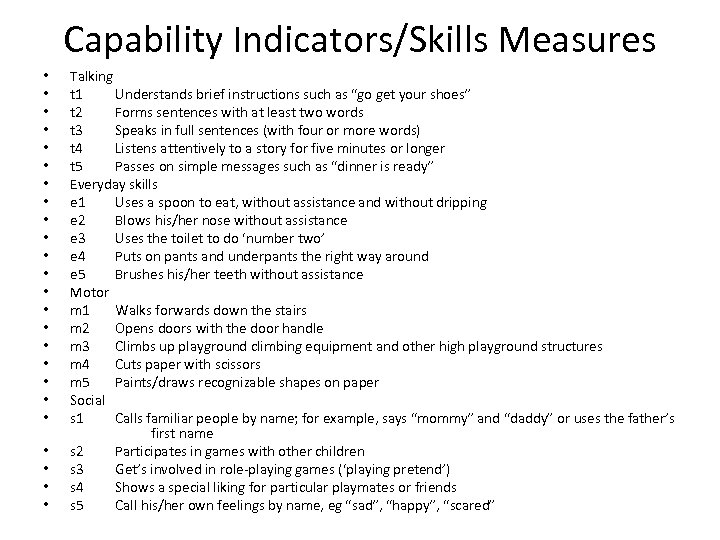 Capability Indicators/Skills Measures • • • • • • Talking t 1 Understands brief instructions such as “go get your shoes” t 2 Forms sentences with at least two words t 3 Speaks in full sentences (with four or more words) t 4 Listens attentively to a story for five minutes or longer t 5 Passes on simple messages such as “dinner is ready” Everyday skills e 1 Uses a spoon to eat, without assistance and without dripping e 2 Blows his/her nose without assistance e 3 Uses the toilet to do ‘number two’ e 4 Puts on pants and underpants the right way around e 5 Brushes his/her teeth without assistance Motor m 1 Walks forwards down the stairs m 2 Opens doors with the door handle m 3 Climbs up playground climbing equipment and other high playground structures m 4 Cuts paper with scissors m 5 Paints/draws recognizable shapes on paper Social s 1 Calls familiar people by name; for example, says “mommy” and “daddy” or uses the father’s first name s 2 Participates in games with other children s 3 Get’s involved in role-playing games (‘playing pretend’) s 4 Shows a special liking for particular playmates or friends s 5 Call his/her own feelings by name, eg “sad”, “happy”, “scared”
