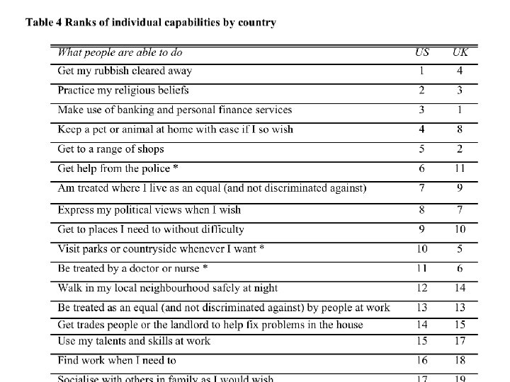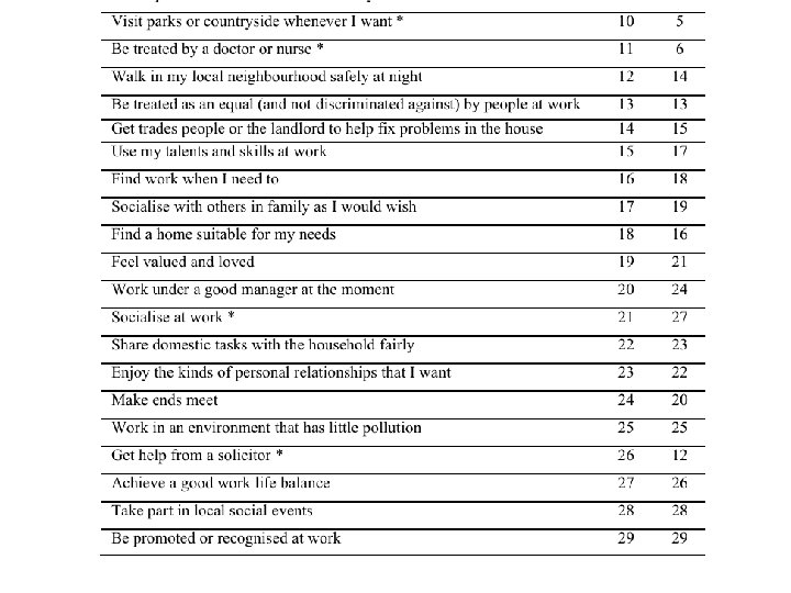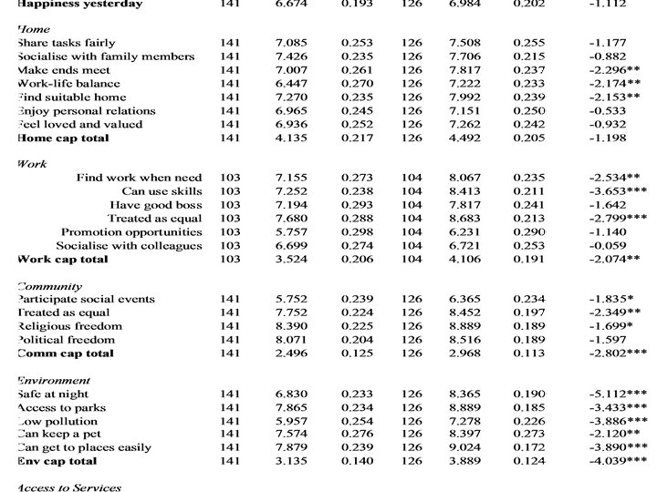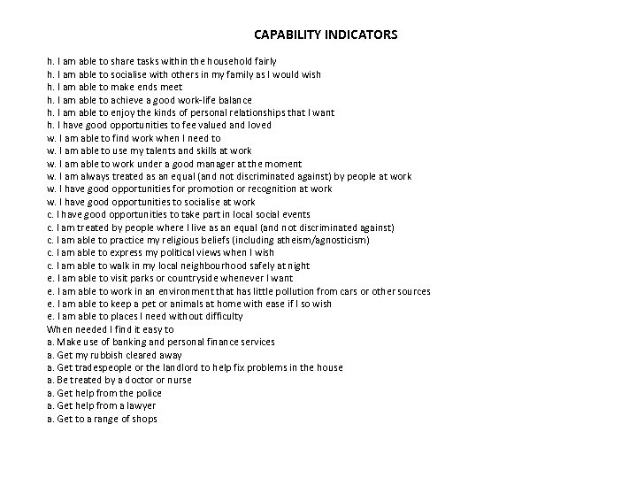 CAPABILITY INDICATORS h. I am able to share tasks within the household fairly h. I am able to socialise with others in my family as I would wish h. I am able to make ends meet h. I am able to achieve a good work-life balance h. I am able to enjoy the kinds of personal relationships that I want h. I have good opportunities to fee valued and loved w. I am able to find work when I need to w. I am able to use my talents and skills at work w. I am able to work under a good manager at the moment w. I am always treated as an equal (and not discriminated against) by people at work w. I have good opportunities for promotion or recognition at work w. I have good opportunities to socialise at work c. I have good opportunities to take part in local social events c. I am treated by people where I live as an equal (and not discriminated against) c. I am able to practice my religious beliefs (including atheism/agnosticism) c. I am able to express my political views when I wish c. I am able to walk in my local neighbourhood safely at night e. I am able to visit parks or countryside whenever I want e. I am able to work in an environment that has little pollution from cars or other sources e. I am able to keep a pet or animals at home with ease if I so wish e. I am able to places I need without difficulty When needed I find it easy to a. Make use of banking and personal finance services a. Get my rubbish cleared away a. Get tradespeople or the landlord to help fix problems in the house a. Be treated by a doctor or nurse a. Get help from the police a. Get help from a lawyer a. Get to a range of shops