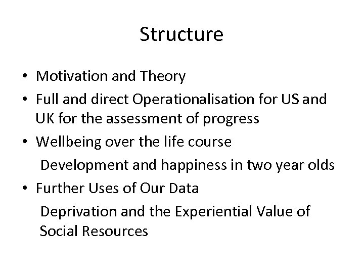 Structure • Motivation and Theory • Full and direct Operationalisation for US and UK for the assessment of progress • Wellbeing over the life course Development and happiness in two year olds • Further Uses of Our Data Deprivation and the Experiential Value of Social Resources