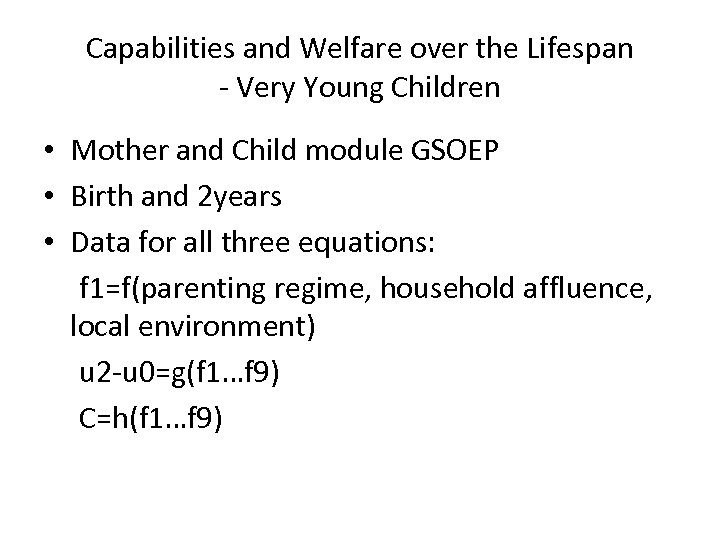 Capabilities and Welfare over the Lifespan - Very Young Children • Mother and Child module GSOEP • Birth and 2 years • Data for all three equations: f 1=f(parenting regime, household affluence, local environment) u 2 -u 0=g(f 1…f 9) C=h(f 1…f 9)