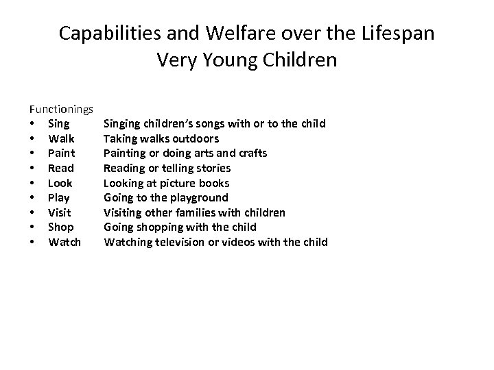 Capabilities and Welfare over the Lifespan Very Young Children Functionings • Sing • Walk • Paint • Read • Look • Play • Visit • Shop • Watch Singing children’s songs with or to the child Taking walks outdoors Painting or doing arts and crafts Reading or telling stories Looking at picture books Going to the playground Visiting other families with children Going shopping with the child Watching television or videos with the child