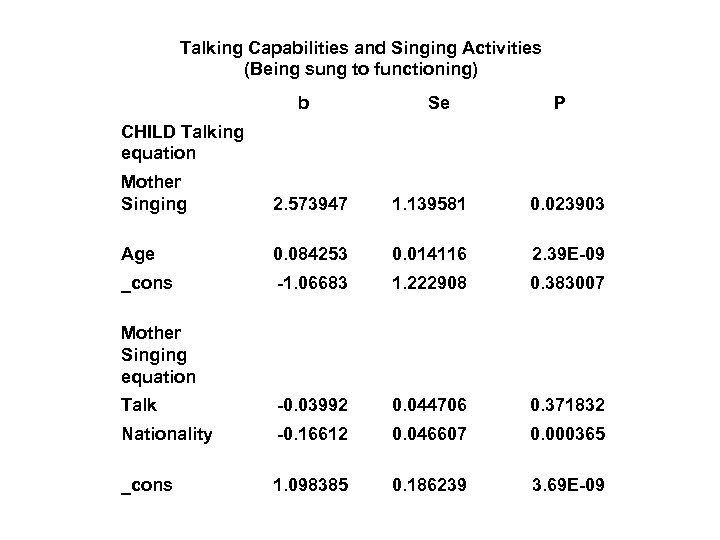 Talking Capabilities and Singing Activities (Being sung to functioning) b Se P CHILD Talking equation Mother Singing 2. 573947 1. 139581 0. 023903 Age 0. 084253 0. 014116 2. 39 E-09 _cons -1. 06683 1. 222908 0. 383007 Talk -0. 03992 0. 044706 0. 371832 Nationality -0. 16612 0. 046607 0. 000365 _cons 1. 098385 0. 186239 3. 69 E-09 Mother Singing equation