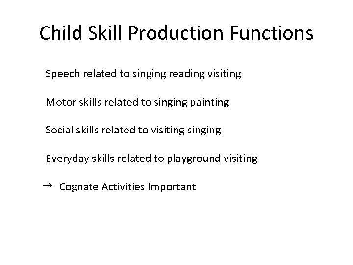 Child Skill Production Functions Speech related to singing reading visiting Motor skills related to singing painting Social skills related to visiting singing Everyday skills related to playground visiting Cognate Activities Important