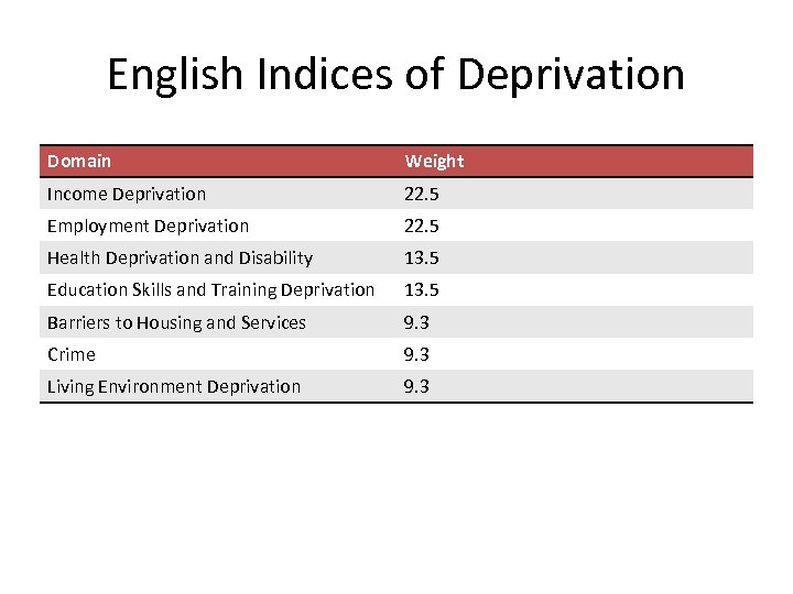 English Indices of Deprivation Domain Weight Income Deprivation 22. 5 Employment Deprivation 22. 5 Health Deprivation and Disability 13. 5 Education Skills and Training Deprivation 13. 5 Barriers to Housing and Services 9. 3 Crime 9. 3 Living Environment Deprivation 9. 3