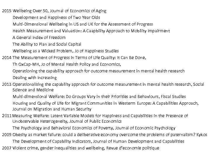 2015 Wellbeing Over 50, Journal of Economics of Aging Development and Happiness of Two Year Olds Multi-Dimensional Wellbeing in US and UK for the Assessment of Progress Health Measurement and Valuation: A Caapbility Approach to Mobility Impairment A General Index of Freedom The Ability to Plan and Social Capital Wellbeing as a Wicked Problem, Jo of Happiness Studies 2014 The Measurement of Progress in Terms of Life Quality: It Can Be Done, Th Ox. Cap-MH, Jo of Mental Health Policy and Economics, Operationing the capability approach for outcome measurement in mental health research Dealing with Increasing 2013 Operationalising the capability approach for outcome measurement in mental health research, Social Science and Medicine Multi-dimensional Welfare: Do Groups Vary in their Priorities and Behaviours, Fiscal Studies Housing and Quality of Life for Migrant Communities in Westerm Europe: A Capabilities Approach, Journal on Migration and Human Security 2011 Measuring Welfare: Latent Variable Models for Happiness and Capabilities in the Presence of Unobservable Heterogeneity, Journal of Public Economics The Psychology and Behavioral Economics of Poverty, Journal of Economic Psychology 2009 Obesity as market failure: could a deliberative economy overcome the problems of paternalism? Kykos The Development of Capability Indicators, Journal of Human Development and Capabilities 2007 Violent crime, gender inequalities and wellbeing, Revue d’economie politique