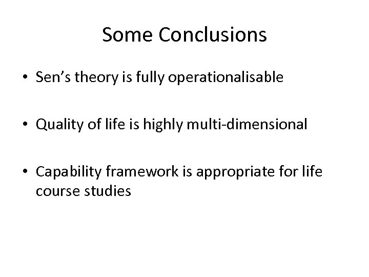 Some Conclusions • Sen’s theory is fully operationalisable • Quality of life is highly multi-dimensional • Capability framework is appropriate for life course studies