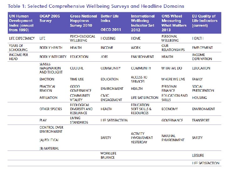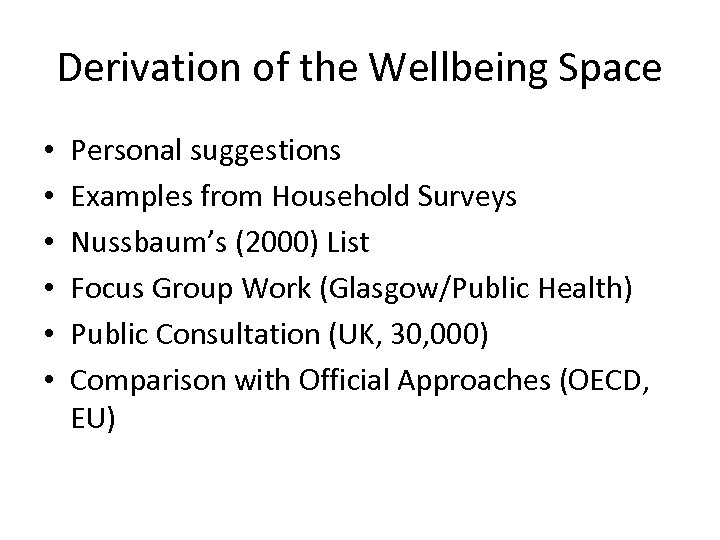 Derivation of the Wellbeing Space • • • Personal suggestions Examples from Household Surveys Nussbaum’s (2000) List Focus Group Work (Glasgow/Public Health) Public Consultation (UK, 30, 000) Comparison with Official Approaches (OECD, EU)