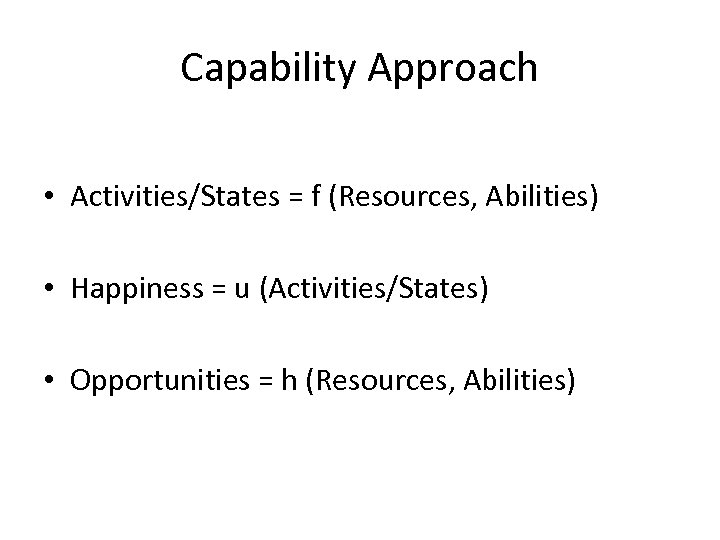 Capability Approach • Activities/States = f (Resources, Abilities) • Happiness = u (Activities/States) • Opportunities = h (Resources, Abilities)