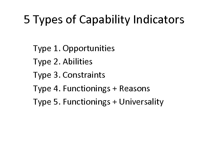 5 Types of Capability Indicators Type 1. Opportunities Type 2. Abilities Type 3. Constraints Type 4. Functionings + Reasons Type 5. Functionings + Universality