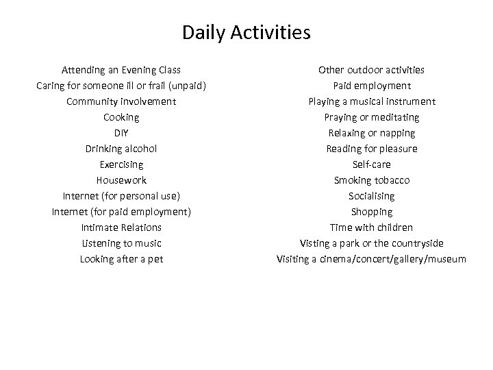 Daily Activities Attending an Evening Class Caring for someone ill or frail (unpaid) Community involvement Cooking DIY Drinking alcohol Exercising Housework Internet (for personal use) Internet (for paid employment) Intimate Relations Listening to music Looking after a pet Other outdoor activities Paid employment Playing a musical instrument Praying or meditating Relaxing or napping Reading for pleasure Self-care Smoking tobacco Socialising Shopping Time with children Visting a park or the countryside Visiting a cinema/concert/gallery/museum
