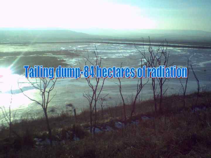 Tailing dump is 3 huge black lakes, which waste dumps went to hydrometallurgical plant. Their area is 84 hectares, they left all the radium, polonium-250, lead-206, solid radioactive waste.