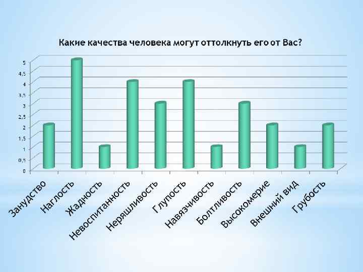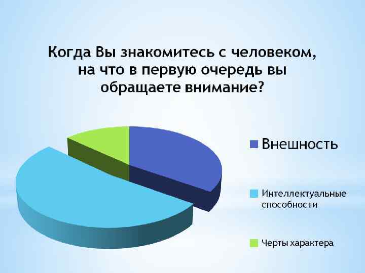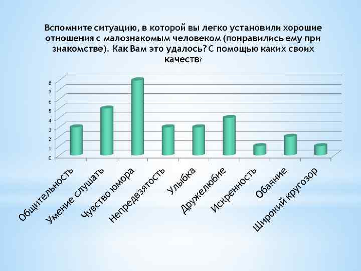 Список вопросов: Когда Вы знакомитесь с человеком, на что в первую очередь вы обращаете внимание? Какие качества человека могут оттолкнуть его от Вас? Влияет ли внешняя привлекательность человека на Ваше отношение к нему? При подготовке к важной встрече/выступлению на что Вы обращаете внимание? (речь, интонация, внешний вид, выражение лица и пр. ) Вспомните ситуацию, в которой вы легко установили хорошие отношения с малознакомым человеком (понравились ему при знакомстве). Как Вам это удалось? С помощью каких своих качеств?