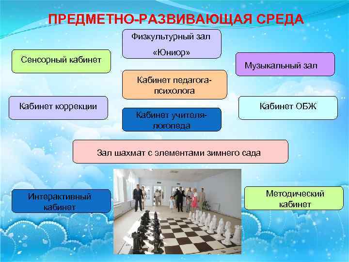 ПРЕДМЕТНО-РАЗВИВАЮЩАЯ СРЕДА Физкультурный зал Сенсорный кабинет «Юниор» Музыкальный зал Кабинет педагогапсихолога Кабинет коррекции Кабинет учителялогопеда Кабинет ОБЖ Зал шахмат с элементами зимнего сада Интерактивный кабинет Методический кабинет