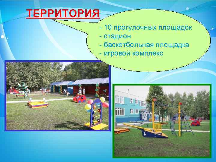 ТЕРРИТОРИЯ - 10 прогулочных площадок - стадион - баскетбольная площадка - игровой комплекс