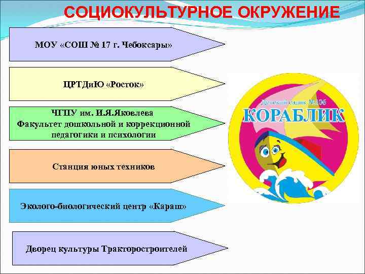 СОЦИОКУЛЬТУРНОЕ ОКРУЖЕНИЕ МОУ «СОШ № 17 г. Чебоксары» ЦРТДи. Ю «Росток» ЧГПУ им. И. Я. Яковлева Факультет дошкольной и коррекционной педагогики и психологии Станция юных техников Эколого-биологический центр «Караш» Дворец культуры Тракторостроителей