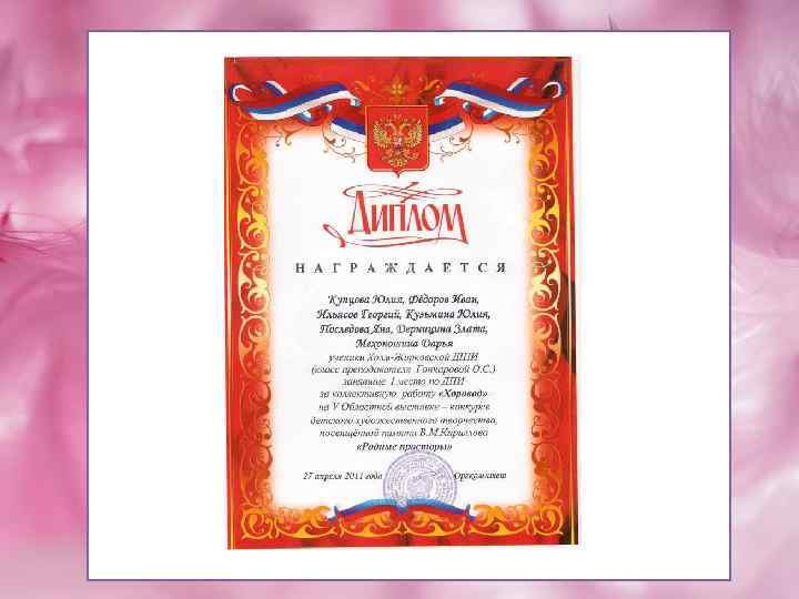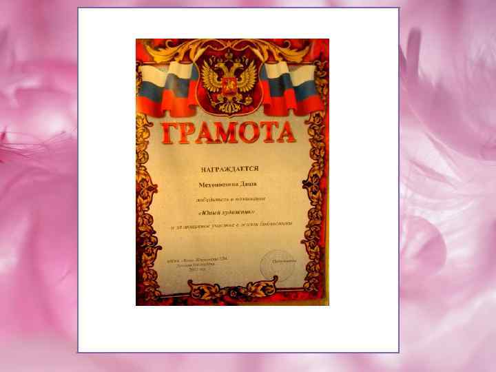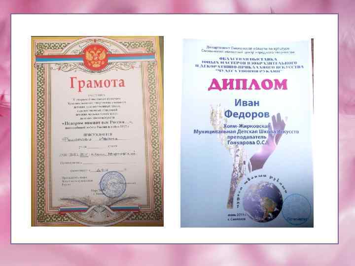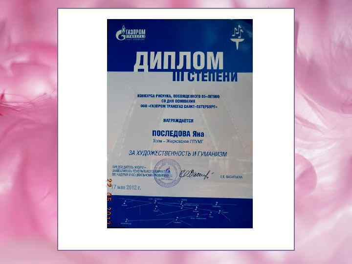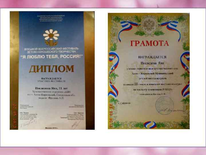 Работа Яны Последовой « 9 мая» участвовала во многих выставках и была отмечена грамотами и дипломами. И по итогам Всероссийского фестиваля была опубликована в каталоге детских рисунков «Я люблю тебя Россия !» . 12 лет