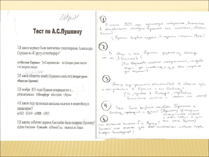 Форма – составление учениками тестовых вопросов по биографии А. С. Пушкина. Цель – узнать, как учащиеся самостоятельно освоили новый материал, и стимулировать их познавательный интерес. Инструкция – составить дома в письменном виде тестовые вопросы по биографии А. С. Пушкина и указать ответы к ним.