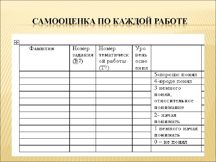 Ученики внимательно изучают все свои отметки по теме, анализируют, какой тип работы им удается лучше, какой хуже, размышляют, что делать для повышения результатов. Полностью исключается ситуация, когда школьник не понимает, почему у него выходит та или иная отметка за отчетный период, слишком поздно узнает о том, что нужно начать больше уделять внимания предмету. Учитель гораздо лучше узнает учеников, их отношения становятся более доверительными. Дети понимают важность умения адекватно оценивать себя, что является первым шагом к решению проблемы Появляется письменный план действий на ближайший период с целью повышения качества знаний.