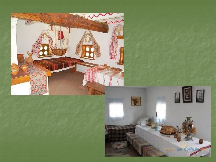 Дома располагались очень компактно, расстояние между хатами, особенно в центре станицы, могло составлять лишь несколько метров. Дома богатых и бедных строились на один образец – из двух комнат: одной побольше – «горницы» и меньше «стряпухи» . n В хатах было просто и уютно. Внутри домов всегда одна половина чистая, заботливо прибранная (горница). Здесь находились стол, сундук, лавки, грубка с лежанкой, за ней настил, где спали (полок).