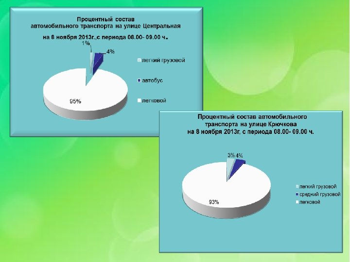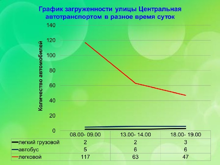 Наблюдение в пунктах 1 и 2 велось одновременно в течении одного дня- 8 ноября. С 8. 00 - 9. 00 ч, 13. 00 - 14. 00 ч, 18. 00 - 19. 00 ч. 1 пункт. Улица Центральная Автомобили 8. 00 - 9. 00 13. 00 - 14. 00 18. 00 - 19. 00 Итого Легкий грузовой 2 шт. 1% (PI= 0, 016) 2 шт. 3 шт. 7 шт. Автобус 5 шт. 4% (PI= 0, 04) 6 шт. 17 шт. Легковой 117 шт. 95% (PI= 0, 944) 63 шт. 47 шт. 227 шт. Итого 124 шт. (PI= 1) 71 шт. 56 шт. 251 шт.