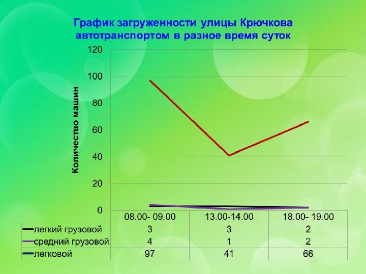 2 пункт. Улица Крючкова. Автомобили 08. 00 -09. 00 13. 00 - 14. 00 18. 00 - 19. 00 Итого Легкий грузовой 3 шт. 3% (PI= 0, 028) 3 шт. 2 шт 8 шт. Средний грузовой 4 шт. 4 % (PI= 0, 038) 1 шт. 2 шт. 7 шт. Легковой 97 шт. 93% (PI= 0, 934) 41 шт. 66 шт. 204 шт. Итого 104 шт. 100% (PI= 1) 45 шт. 70 шт. 219 шт.