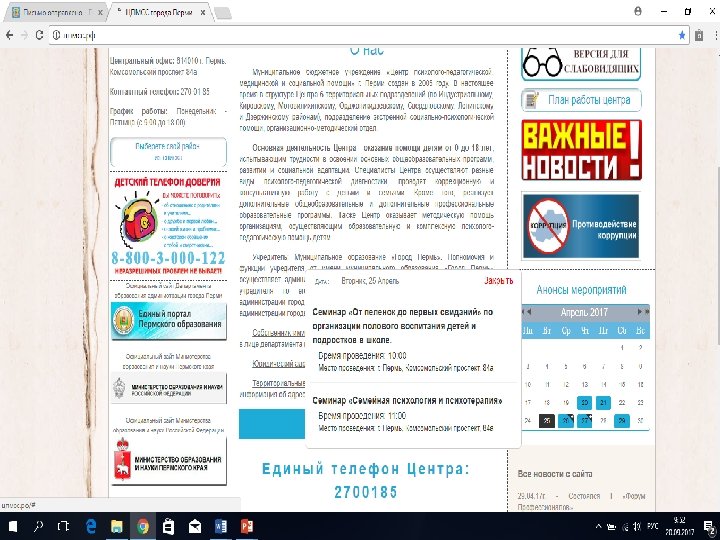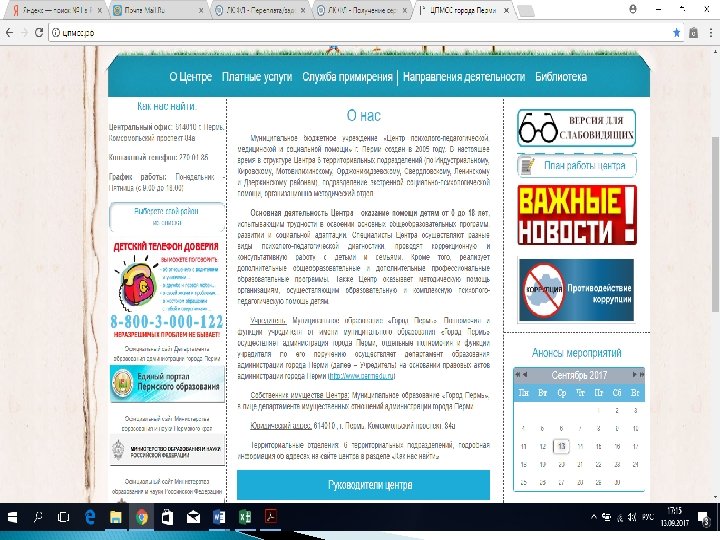 МУНИЦИПАЛЬНОЕ БЮДЖЕТНОЕ УЧРЕЖДЕНИЕ «ЦЕНТР ПСИХОЛОГО-ПЕДАГОГИЧЕСКОЙ, МЕДИЦИНСКОЙ И СОЦИАЛЬНОЙ ПОМОЩИ» Г. ПЕРМИ Анонсы семинаров и курсов повышения квалификации • Сентябрь: • 28. 09. 2017 г. Семинар для руководителей психолого-медико-педагогических консилиумов образовательных организаций. «Оказание качественных услуг для детей с ограниченными возможностями здоровья» • 10. 00 - Дзержинский, Ленинский, Мотовилихинский, Свердловский районы • 14. 00 - Индустриальный, Кировский, Орджоникидзевский районы
