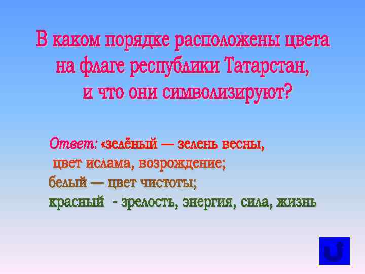 Что символизирует приподнятая правая передняя лапа барса, изображенного на гербе республики Татарстан? Ответ: Приподнятая правая передняя лапа барса — это традиционный геральдический жест, подчёркивающий величие верховной власти Это означает также начало движения (дел «шагом правой ноги» , доброе начало движени Татарстана по пути обновления.