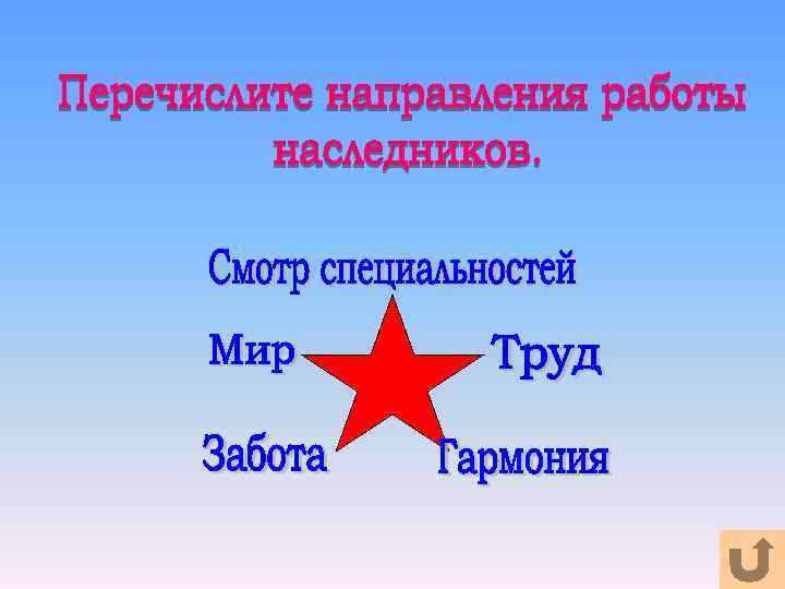 1. "Наследник помогает своей республике , стремится стать достойным гражданином". 2. "Наследник отважно стоит справедливость за ". 3. "Наследник - верный друг, помогает старшим и младшим, никого не бросит в беде". 4. "Наследник хочет больше знать и уметь, стать сильным и ловким". 5. "Наследник бережно хранит природуи культуру родного края".