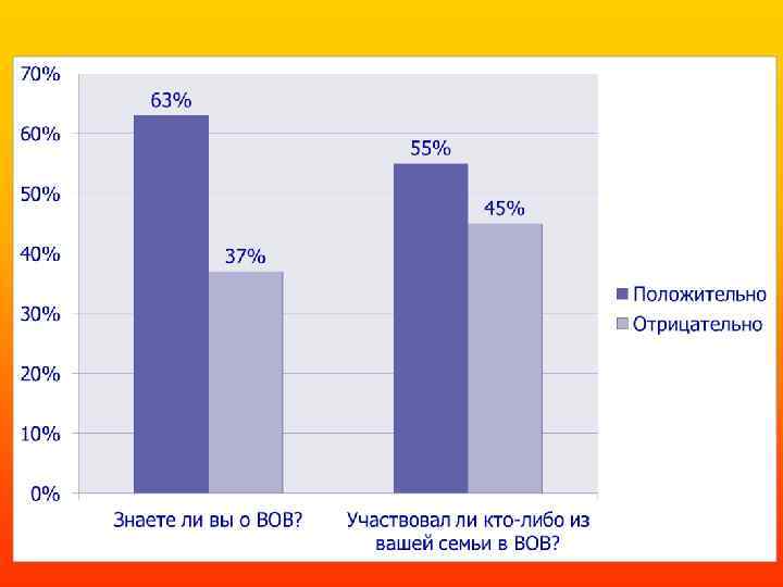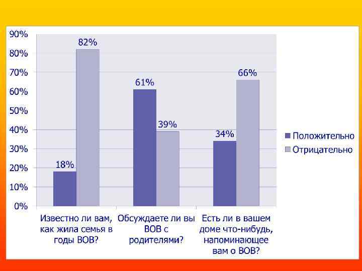 Анкетирование учащихся Вопросы Ответы % Хорошо знают о войне 63% Кто из Вашей семьи воевал в годы Великой Отечественной войны? 55% Как жила семья во время войны, знают 18% Дома о ВОВ говорят с родителями 61% От кого Вы впервые узнали о войне? Что напоминает в вашем доме о войне? Школа – 10 % Родители – 64% Из книг – 2 % По телевидению – 5% 34% ( Медали, ордена , фотографии , письма с фронта )