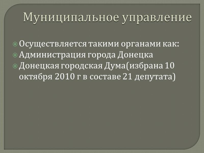 Муниципальное управление Осуществляется такими органами как: Администрация города Донецка Донецкая городская Дума(избрана 10 октября 2010 г в составе 21 депутата)