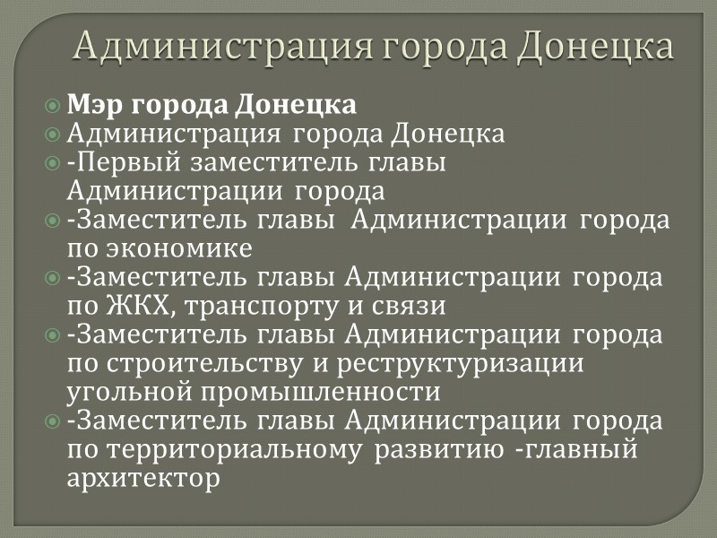 Администрация города Донецка Мэр города Донецка Администрация города Донецка -Первый заместитель главы Администрации города -Заместитель главы Администрации города по экономике -Заместитель главы Администрации города по ЖКХ, транспорту и связи -Заместитель главы Администрации города по строительству и реструктуризации угольной промышленности -Заместитель главы Администрации города по территориальному развитию -главный архитектор